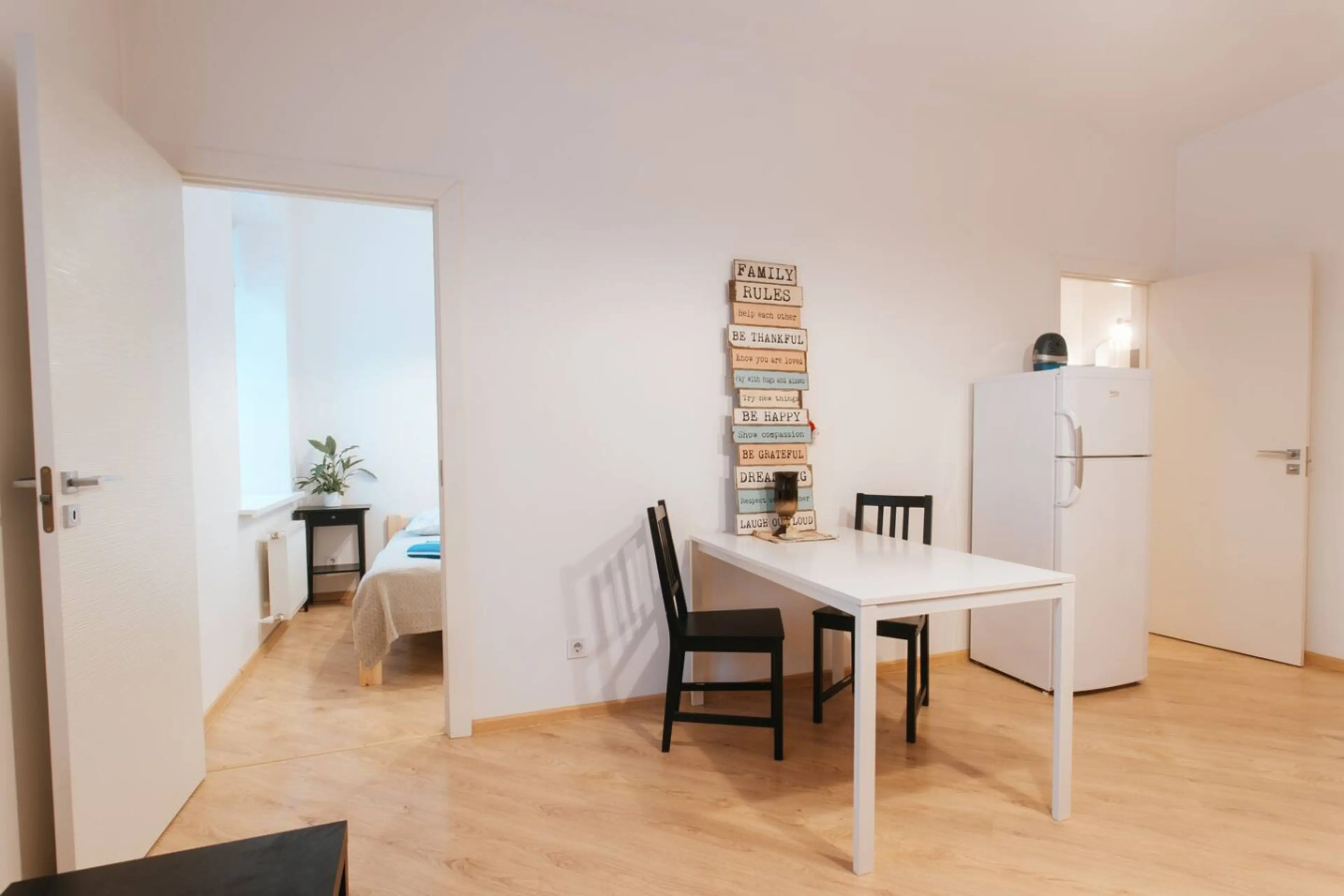 Positive: Self checkin was easy. The location is great, near the bus station, near the supermarket lidl and maxima. You need about 10min by bus to old town. It was warm and cozy.